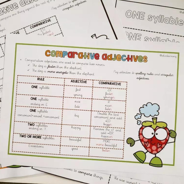 Un recurso para trabajar los superlativos y los comparativos en las clases de inglés. Este material incluye lo siguiente: